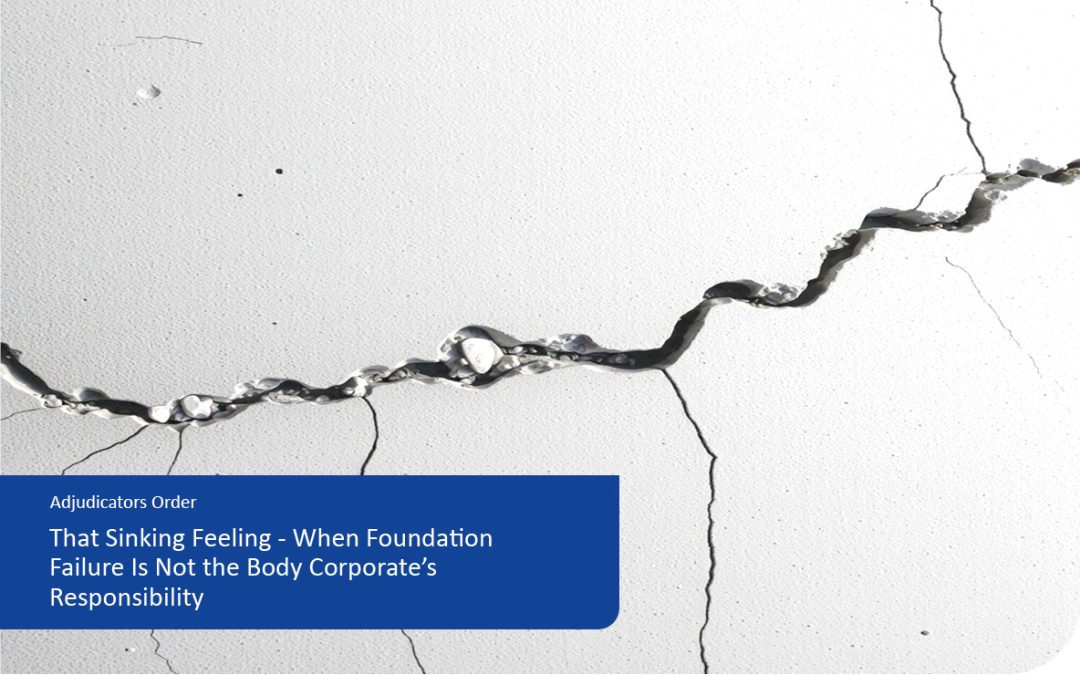 The Applicant recognized that that as a Standard Format Plan complex – the Lot owner would normally be responsible for the foundations to his lot, however, given the Body Corporate was responsible for maintaining infrastructure which ran under his lot (i.e. a large storm water drain), the Applicant argued that settlement of the soil backfilling the storm water pipe had caused his foundations to sink.